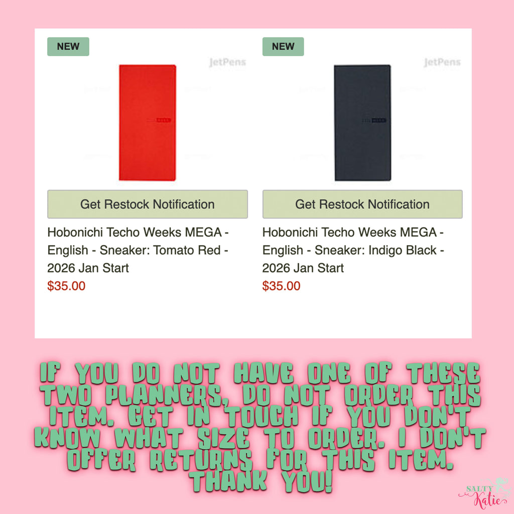 Please do not order this item if you do not have a SNEAKER MEGA WEEKS. It will not fit the hardcover versions of the weeks which are larger than this one. Please get in touch with me if you have a question about what size to order as I do not offer refunds on custom jelly items.